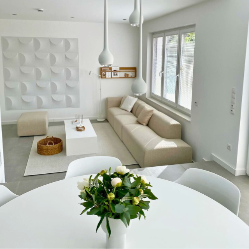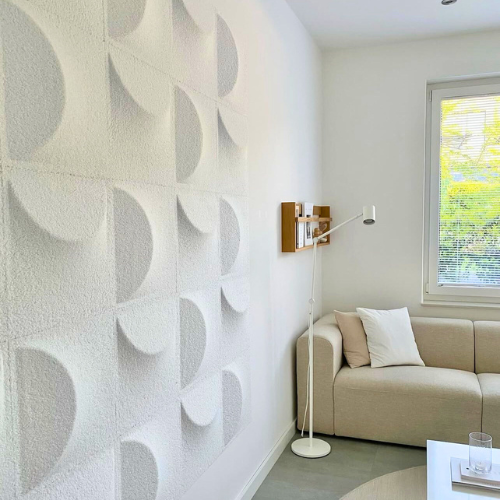 Das Viereck besteht aus einem „Halbmond“, der 3cm nach vorne verläuft. Der „Halbmond“ reduziert Reflektionen und verbessert die Akustik.
